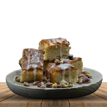 INGREDIENTES: MANTEQUILLA, azúcar moreno, HUEVOS, harina de arroz, almidón de maíz, chocolate blanco, PISTACHOS, vainilla. COBERTURA glasa (azúcar glas, agua, zumo de limón)
