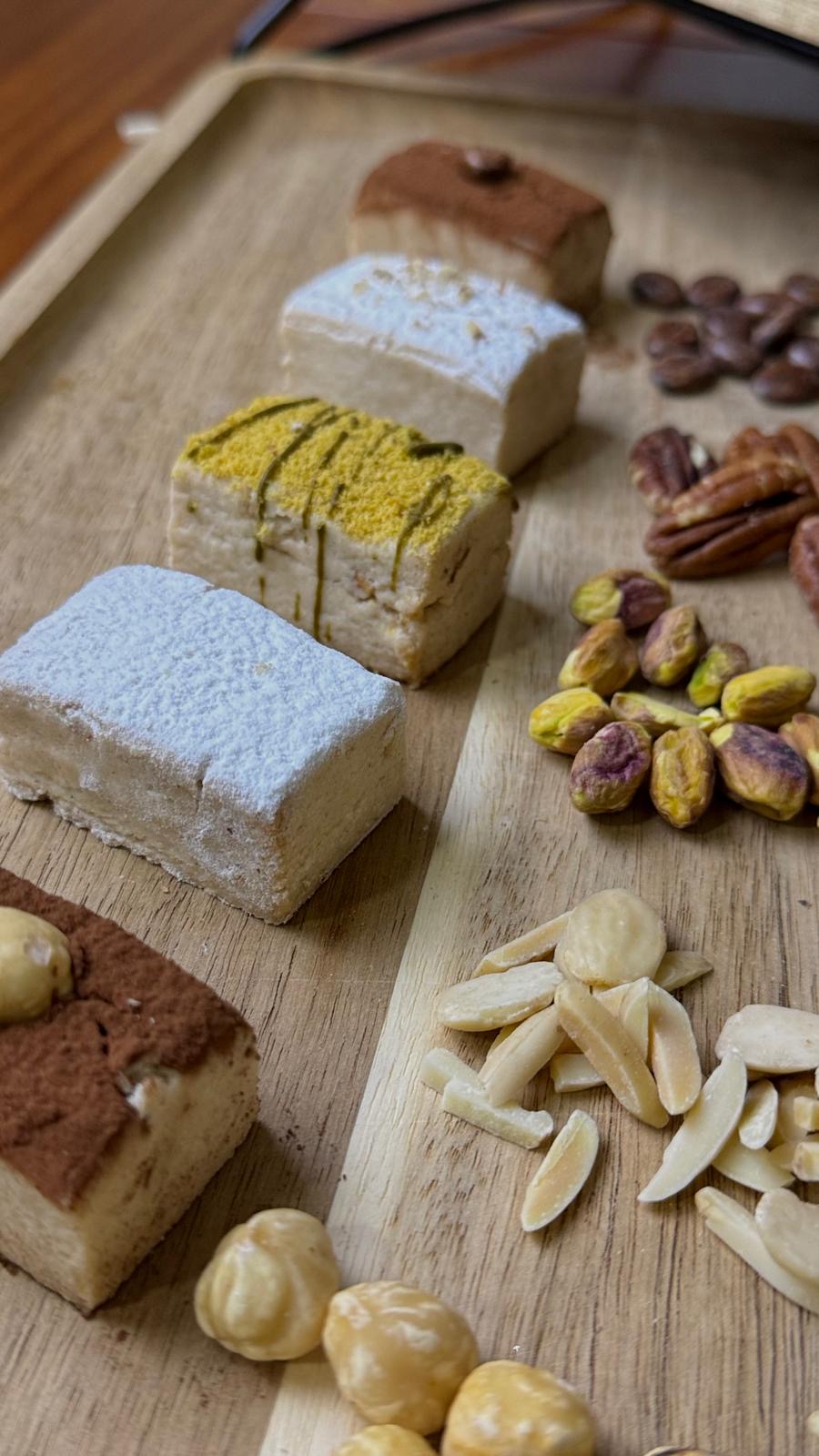 Deliciosos mantecados de bocado de cinco variedades diferentes: pistacho, almendra, choco nougat, tiramisu, pistacho y coco con nuez pecana